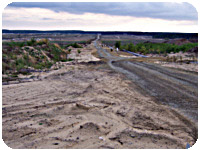 Nach 200 Metern öffnet sich ein Einschnitt einen Hügel hinauf. Der Wald ist abgeholzt, der sandige Boden durchwühlt. Wir nutzten die Schneise als sehr breiten Fusßweg mit den Ausmaßen einer Autobahn. Das macht uns zwar traurig, aber solche Größenordnungen sind wir Münchner auch gewohnt. |